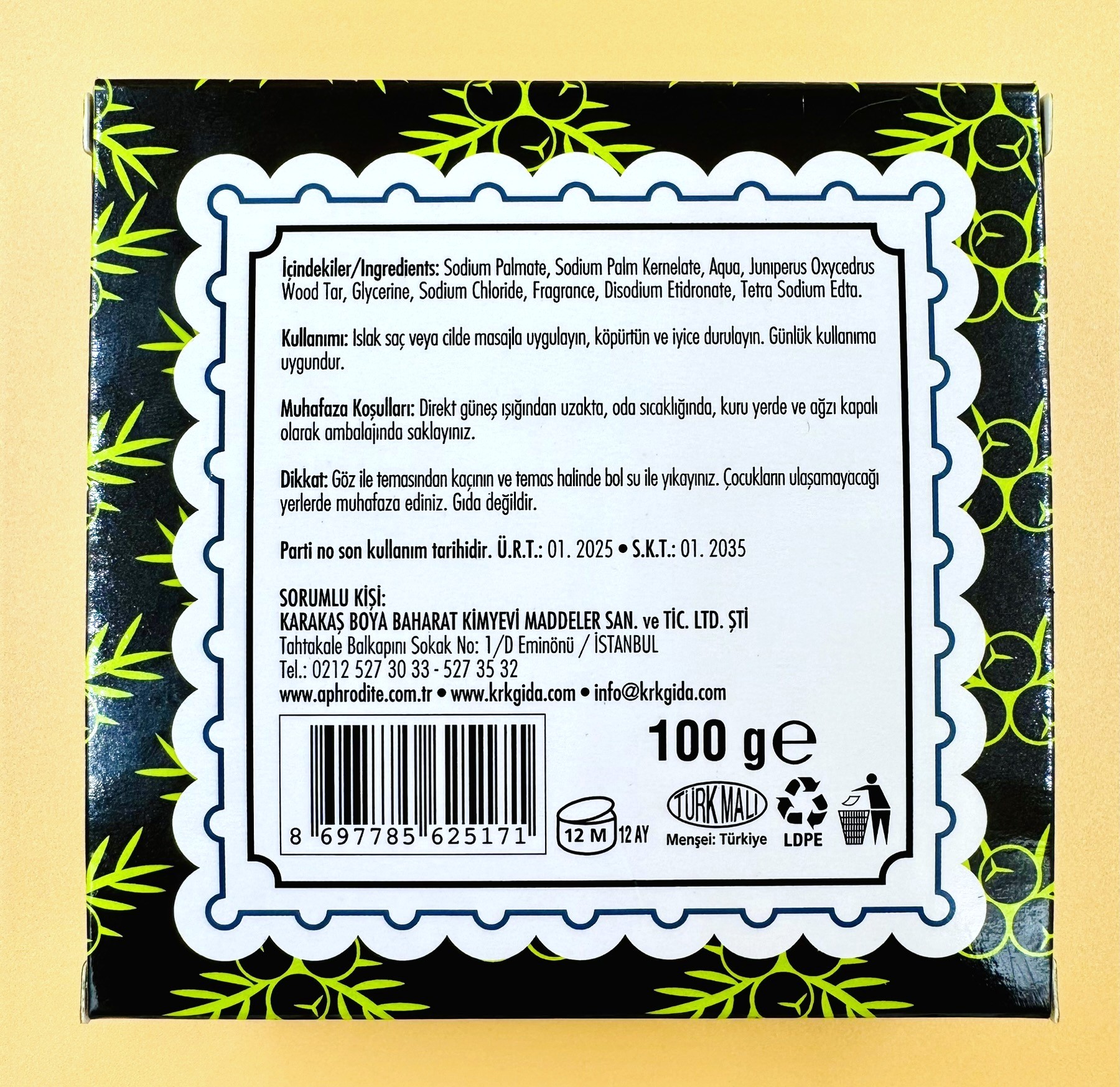 İçindekiler / Ingredients: Sodium Palmate, Sodium Palm Kernelate, Aqua, Juniperus Oxycedrus Wood Tar, Glycerine, Sodium Chloride, Fragrance, Disodium Etidronate, Tetrasodium EDTA.