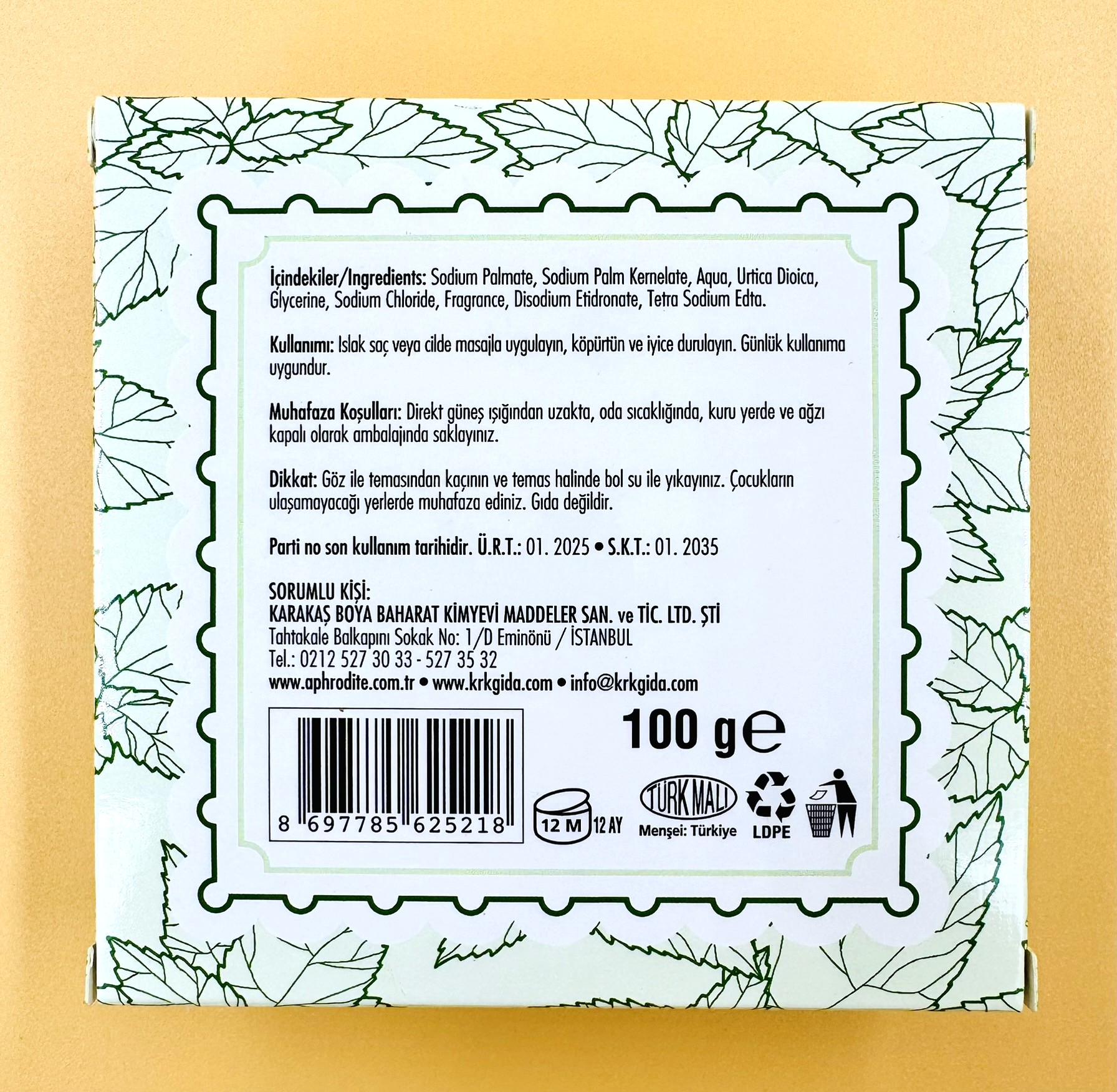 İçindekiler / Ingredients: Sodium Palmate, Sodium Palm Kernelate, Aqua, Urtica Dioica, Glycerine, Sodium Chloride, Fragrance, Disodium Etidronate, Tetrasodium EDTA.