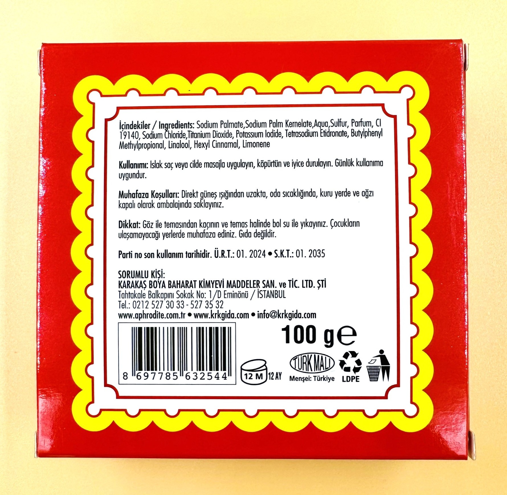 İçindekiler / Ingredients: Sodium Palmate, Sodium Palm Kernelate, Aqua, Sulfur, Parfum, CI 19140, Sodium Chloride, Titanium Dioxide, Potassium Iodide, Tetrasodium Etidronate, Butylphenyl Methylpropional, Linalool, Hexyl Cinnamal, Limonene.