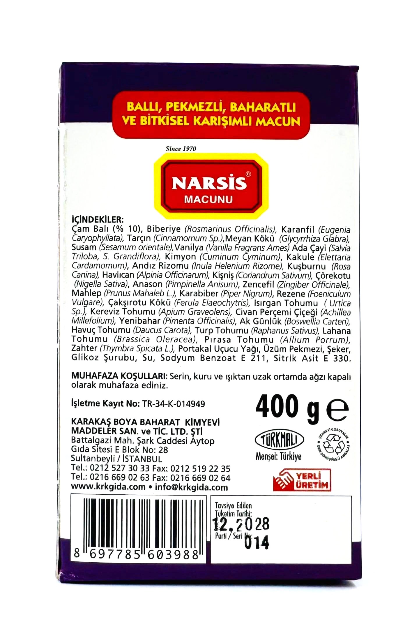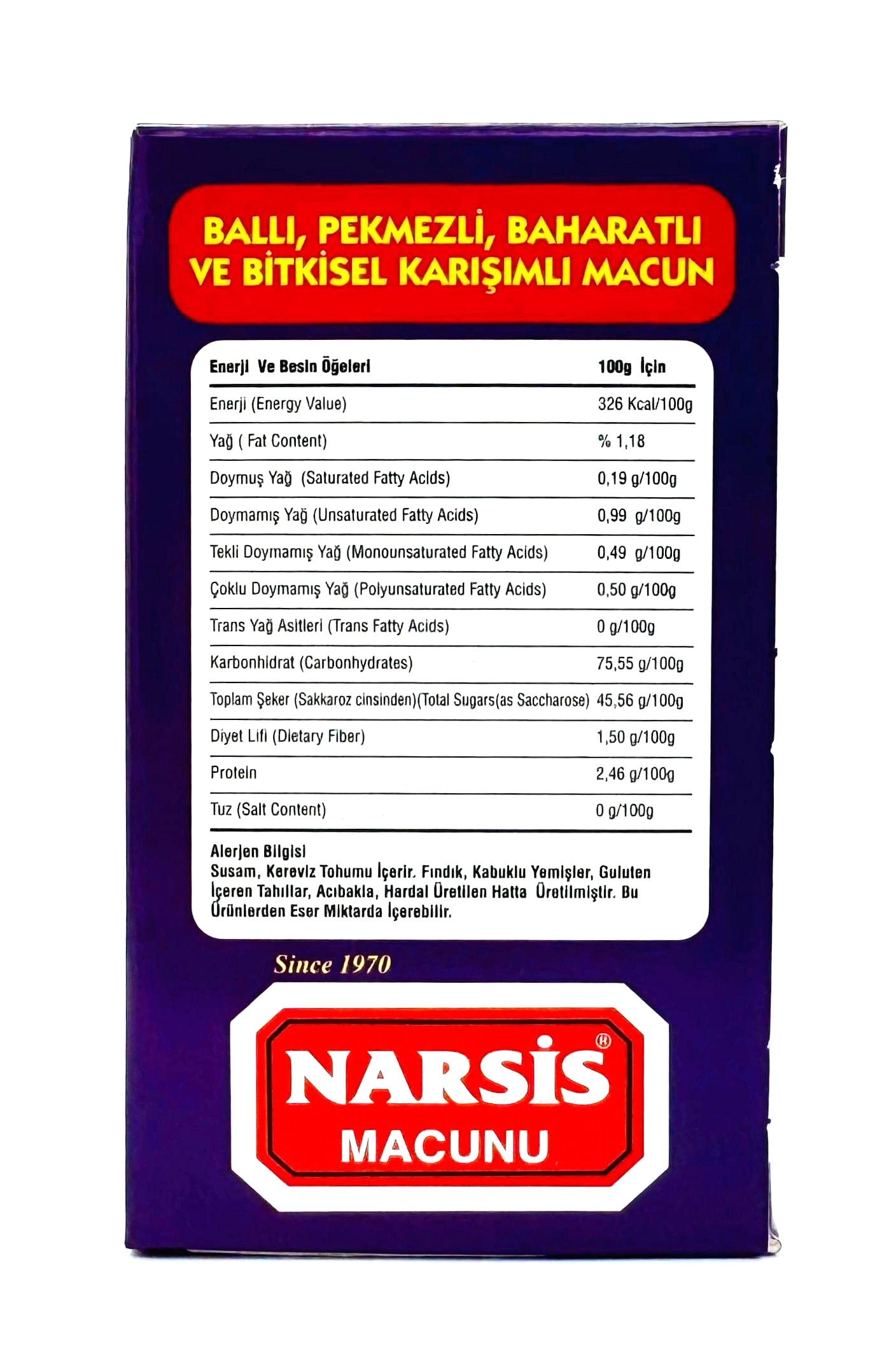 Çam Balı (%10), Biberiye (Rosmarinus Officinalis), Karanfil (Eugenia Caryophyllata), Tarçın (Cinnamomum Sp.), Meyan Kökü (Glycyrrhiza Glabra), Susam (Sesamum orientale), Vanilya (Vanilla Fragrans Ames), Adaçayı (Salvia Triloba, S. Grandiflora), Kimyon (Cuminum Cyminum), Kakule (Elettaria Cardamomum), Andız Rizomu (Inula Helenium Rizome), Kuşburnu (Rosa Canina), Havlıcan (Alpinia Officinarum), Kişniş (Coriandrum Sativum), Çörekotu (Nigella Sativa), Anason (Pimpinella Anisum), Zencefil (Zingiber Officinale), Mahlep (Prunus Mahaleb L.), Karabiber (Piper Nigrum), Rezene (Foeniculum Vulgare), Çakşırotu Kökü (Ferula Elæochytris), Isırgan Tohumu (Urtica Sp.), Kereviz Tohumu (Apium Graveolens), Civan Perçemi Çiçeği (Achillea Millefolium), Yenibahar (Pimenta Officinalis), Ak Günlük (Boswellia Carterii), Havuç Tohumu (Daucus Carota), Turp Tohumu (Raphanus Sativus), Lahana Tohumu (Brassica Oleracea), Pırasa Tohumu (Allium Porrum), Zahter (Thymbra Spicata L.), Portakal Uçucu Yağı, Üzüm Pekmezi, Şeker, Glikoz Şurubu, Su, Sodyum Benzoat E 211, Sitrik Asit E 330.