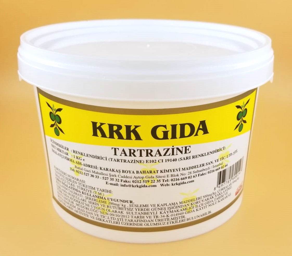 KRK GIDA RENKLENDİRİCİ SARI (TARTARAZİN)(E102) ÜRÜNÜ TÜRK GIDA KODEKSİNE UYGUN DEĞERLERDE ÜRETİLMİŞTİR.